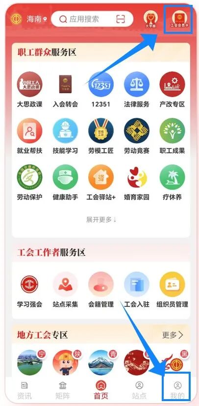 进入职工之家APP后,直接点击首页右上角【工会会员卡】,或在右下角【我的】页面选择【数字身份】,均可进入工会数字身份卡包。