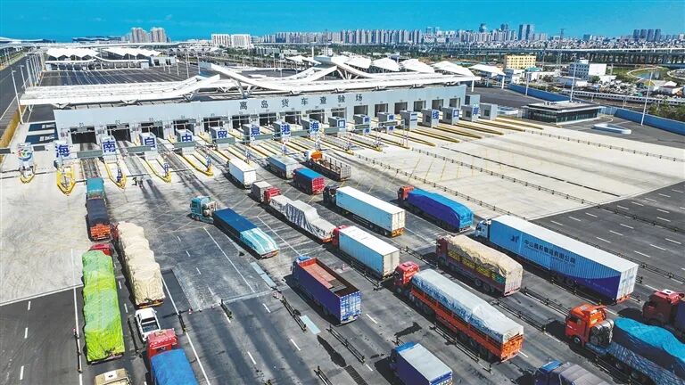 出岛货车有序经过海口新海港和南港“二线口岸”(货运)集中查验场。海南日报全媒体记者 张茂 摄