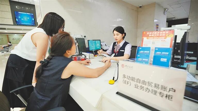 顾客在中国银行海南省分行多功能自由贸易账户(EF)业务办理专柜前咨询。海南日报全媒体记者 张茂 摄