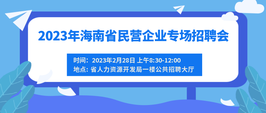 记者从海南省人力资源开发局获悉,继举办建筑业、现代服务业、酒店餐饮业等专场招聘会后,该局将于2月28日在海口举办2023年海南省民营企业专场招聘会,继续为求职者和用人企业搭建对接交流平台。