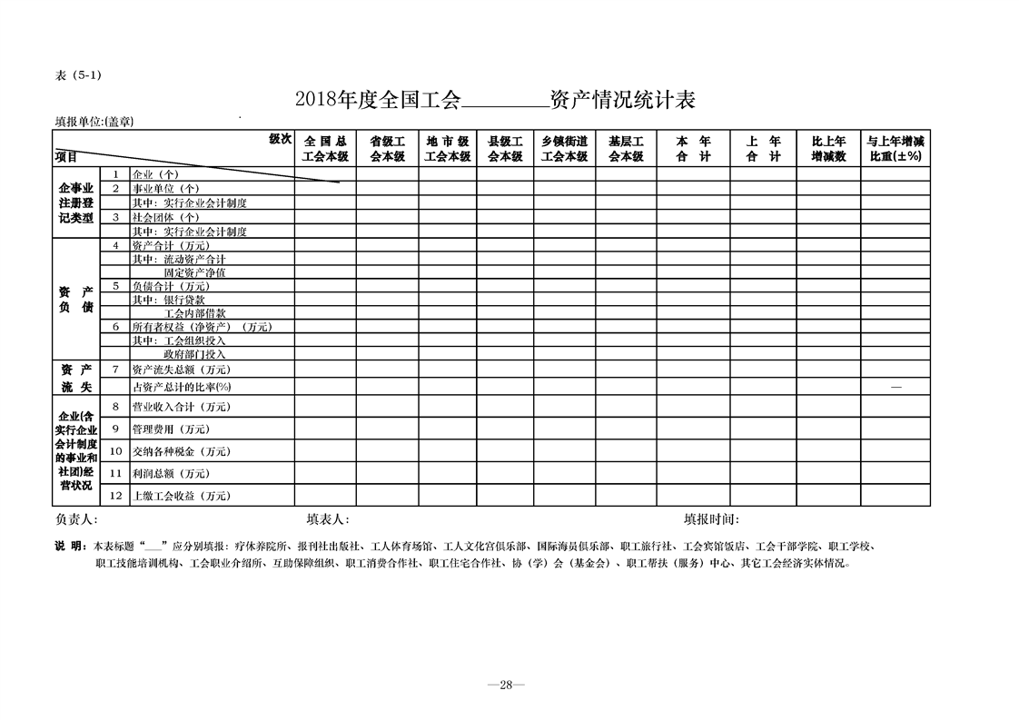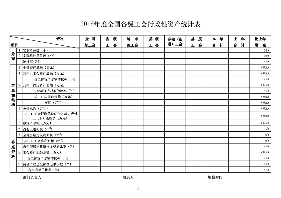 十八、“工会资产流失总额”按各级工会行政单位当年流失的全部工会行政性资产总额填报。