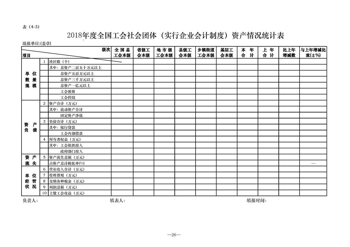 十三、“占全部资产总额的比率(%)”分别为各级次“工会资产总额”、“固定资产总额”和“工会资产流失总额”项目与各级次相应的“全部资产总额”项目分别之比的比率(自动生成)。