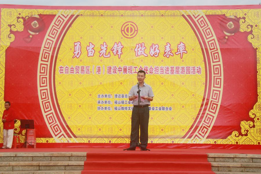 由澄迈县总工会主办,福山镇工会联合会承办,福山咖啡文化风情镇管委会工会联合会协办的“勇当先锋,做好表率——在自由贸易区(港)建设中展现工会使命担当”游园活动,2月18日在澄迈县福山咖啡文化风情镇举行。县总工会常务副主席吴先强。福山镇委书记王锡飞,福山镇镇长黄光涛,福山咖啡文化风情镇管委会主任黄道武等领导出席活动,县总工会常务副主席吴先强同志在活动上做致辞。来自开发区总工会,各镇、各系统工会的职工代表及福山当地的干部职工将近1000余人参加。